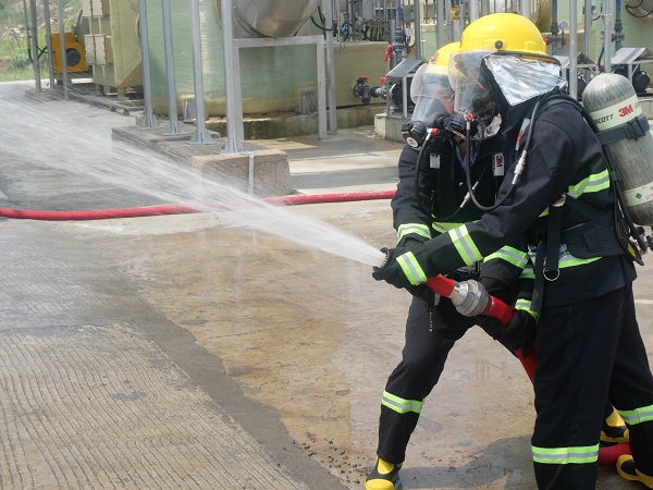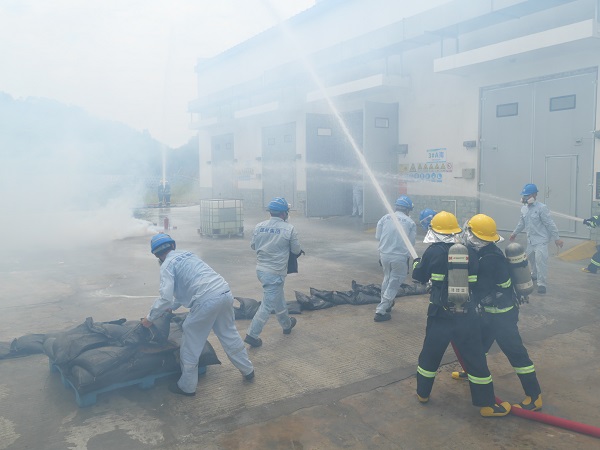 本次應急演練模擬的場景是一名員工在操作叉車轉移廢有機溶劑時,因操作失誤,前叉猛烈撞擊3#暫存倉庫大門,導致廢有機溶劑泄漏并引發火災,造成安全事故。演習中,在模擬事故發生后,中機茂名立刻啟動車間級響應,經過車間組織緊急滅火救援后,火勢仍無法得到控制,且一名滅火員工因吸入有害氣體而出現頭暈、惡心等癥狀,隨即啟動公司級響應,各應急救援小組緊急集合并配合搶險救援,最終順利完成滅火和救援任務。